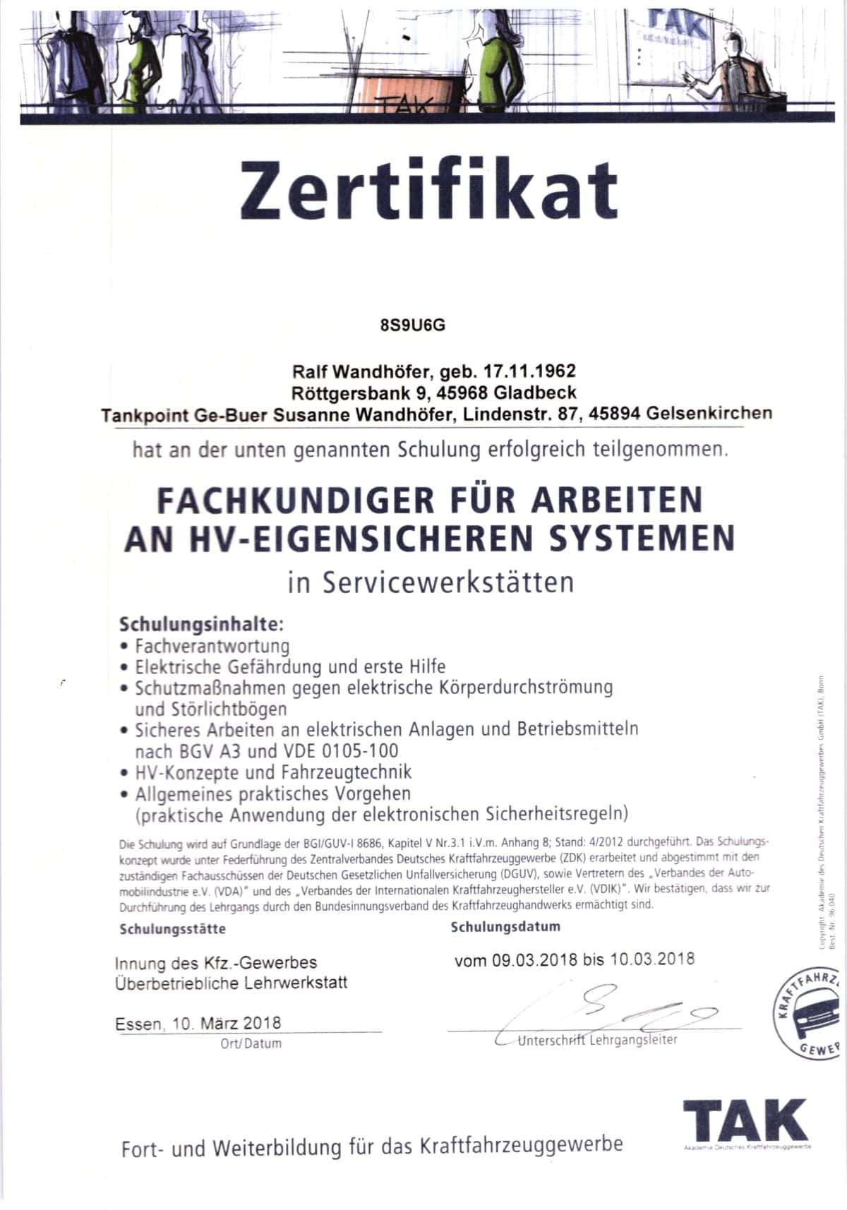 Zertifikat des Kfz-Gutachters, das seine Fachkunde für Arbeiten an HV-eigensicheren Systemen im Fahrzeug bestätigt.